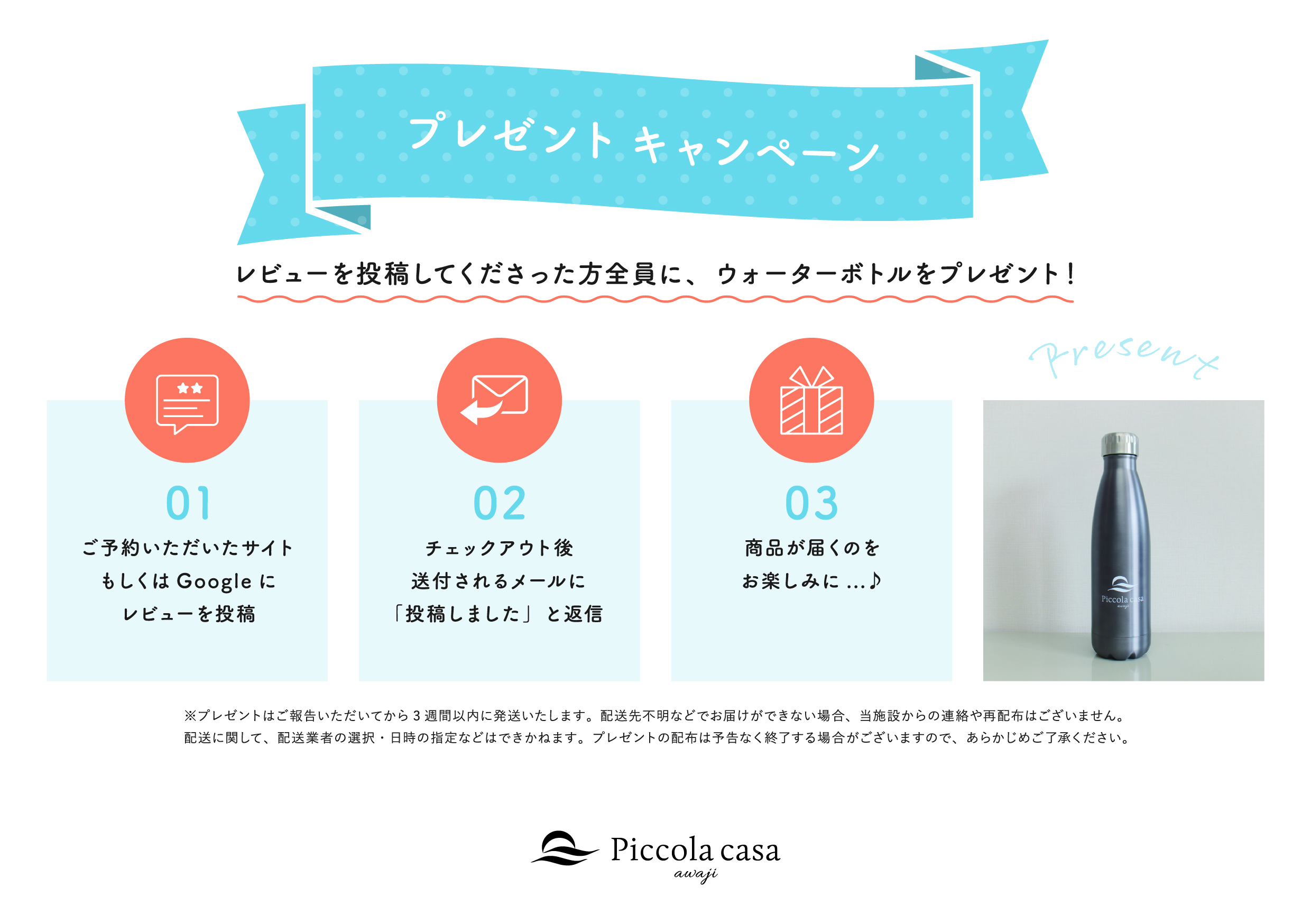ささやかではございますが、後日ウォーターボトルをお送りいたします。